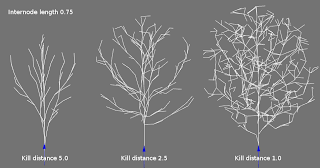 - As the tree skeleton grows endpoints within kill distance are removed. Reducing the kill distance will influence the shape of the tree. The distance is specified in multiples of the internode length.