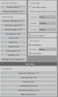 ReplyDelete@victornsy: That is correct, I am afraid this documentation page is a bit behind the developments :-/ The add-on currently works with particle systems for leaves instead of generating the geometry itself. That saves a lot of memory and is more versatile. However, it also means that if you want to change leaf size etc. you have to do that in the particle settings.
