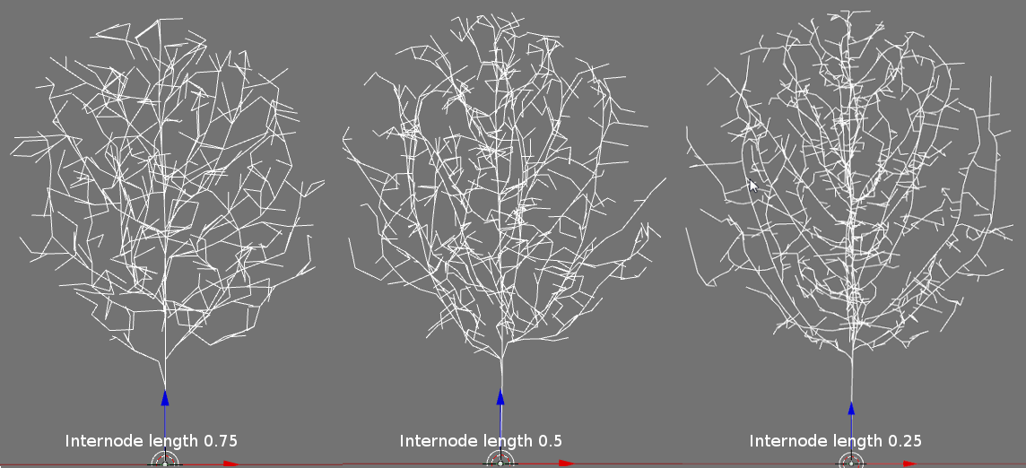 - The length of each branch segment that is added to the tree skeleton. This is roughly (very roughly) analogous to the growth from a bud in a season (an internode). Decreasing the internode length will give a better defined tree.